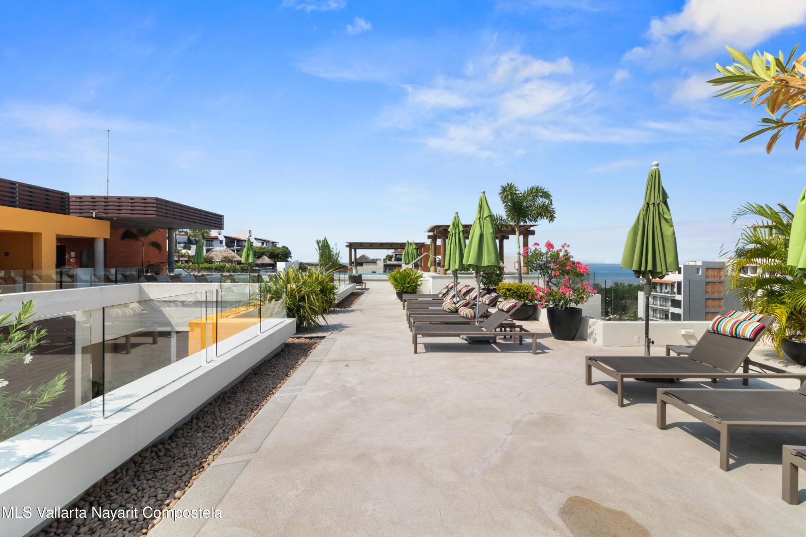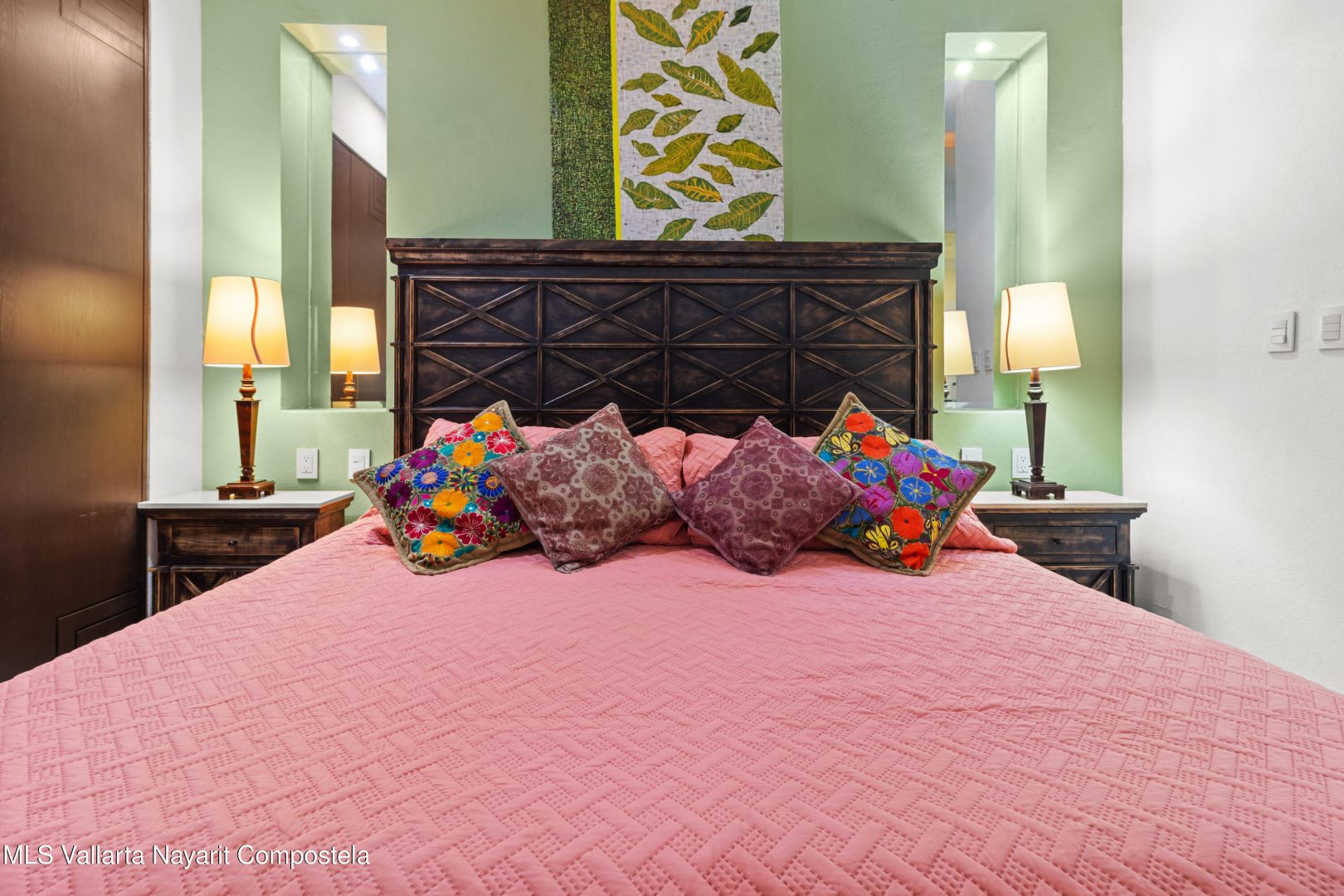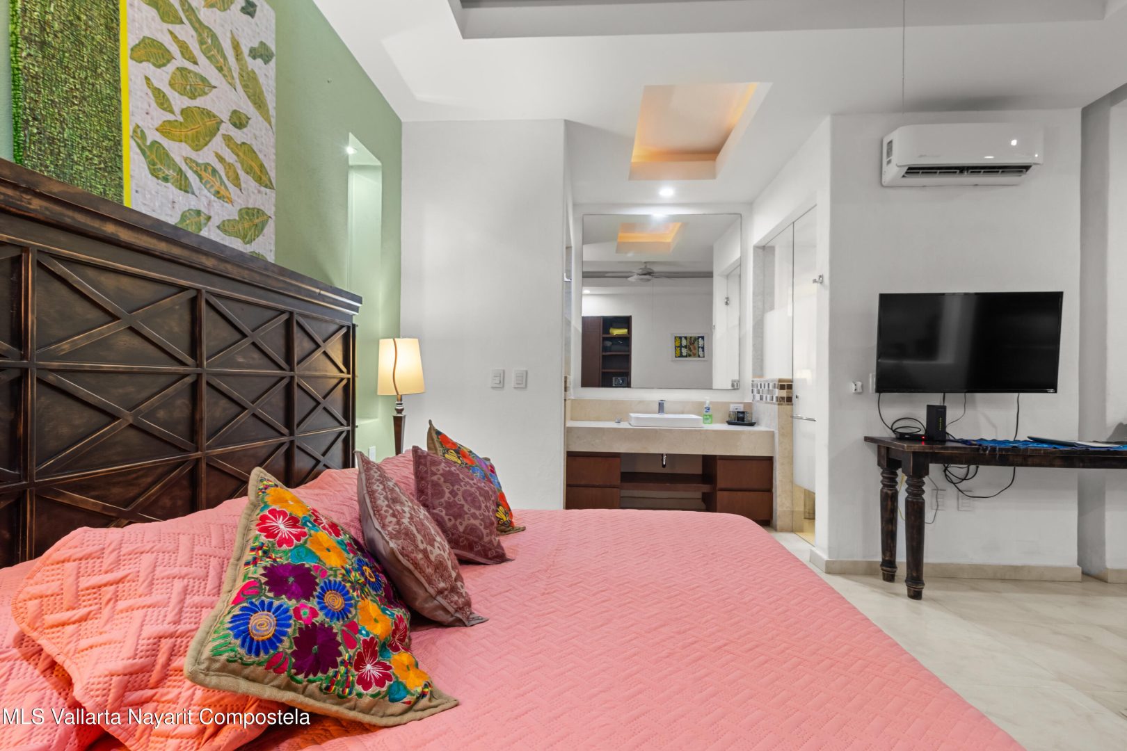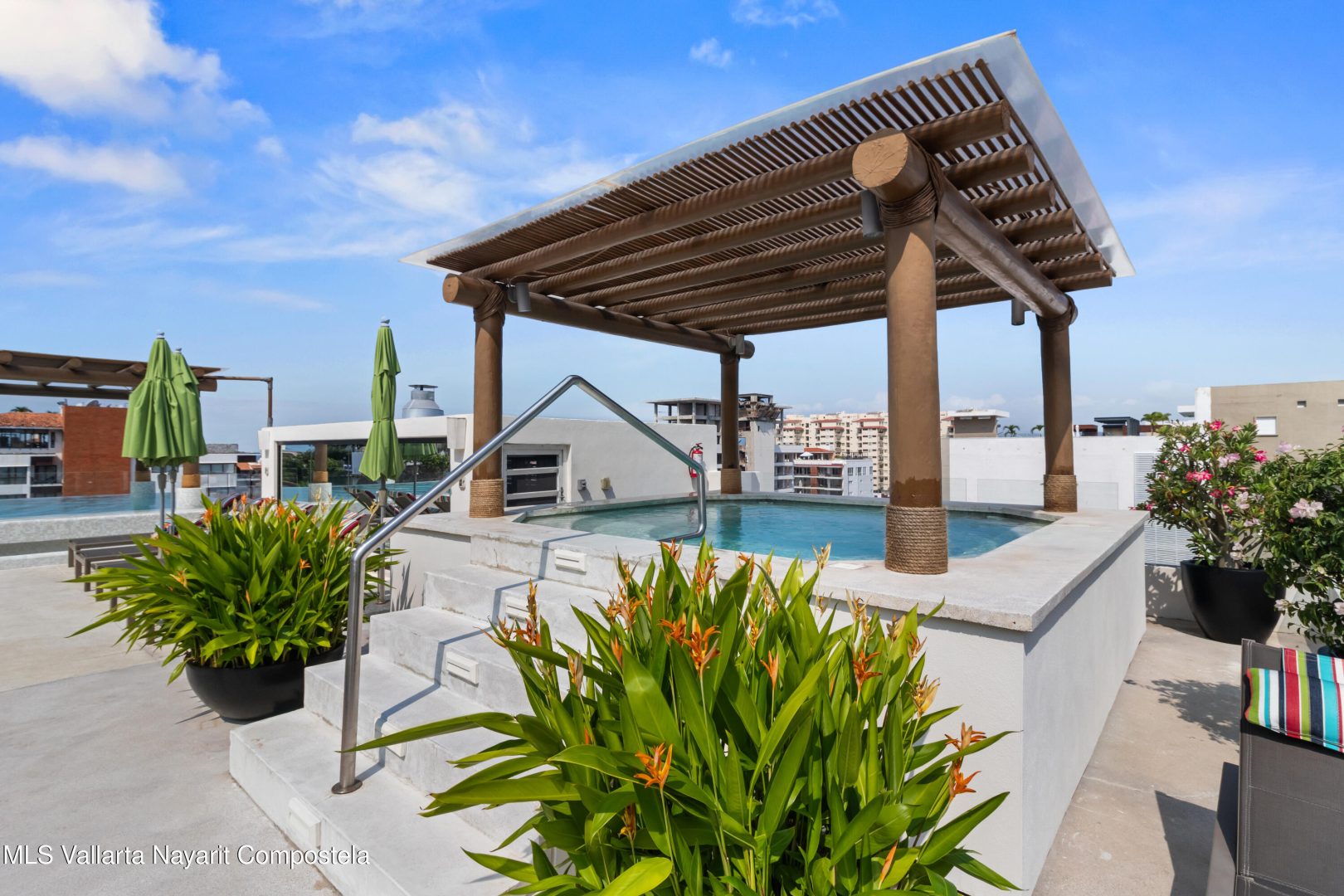 This sophisticated condo offers a perfect blend of comfort and privacy. Located on the 3rd-floor. The rooftop terrace boasts a heated infinity pool, Jacuzzi, BBQ grill, bar, and areas for dining and lounging, all with stunning 360-degree views of the Bay of Banderas, Sierra Madre Mountains, and Puerto Vallarta’s city lights. The remodeled one-bedroom, one-bath unit features a king-size bed, high-speed Wi-Fi, smart TV, air conditioning, a fully equipped kitchen, full-sized washer and dryer, and private parking and storage.