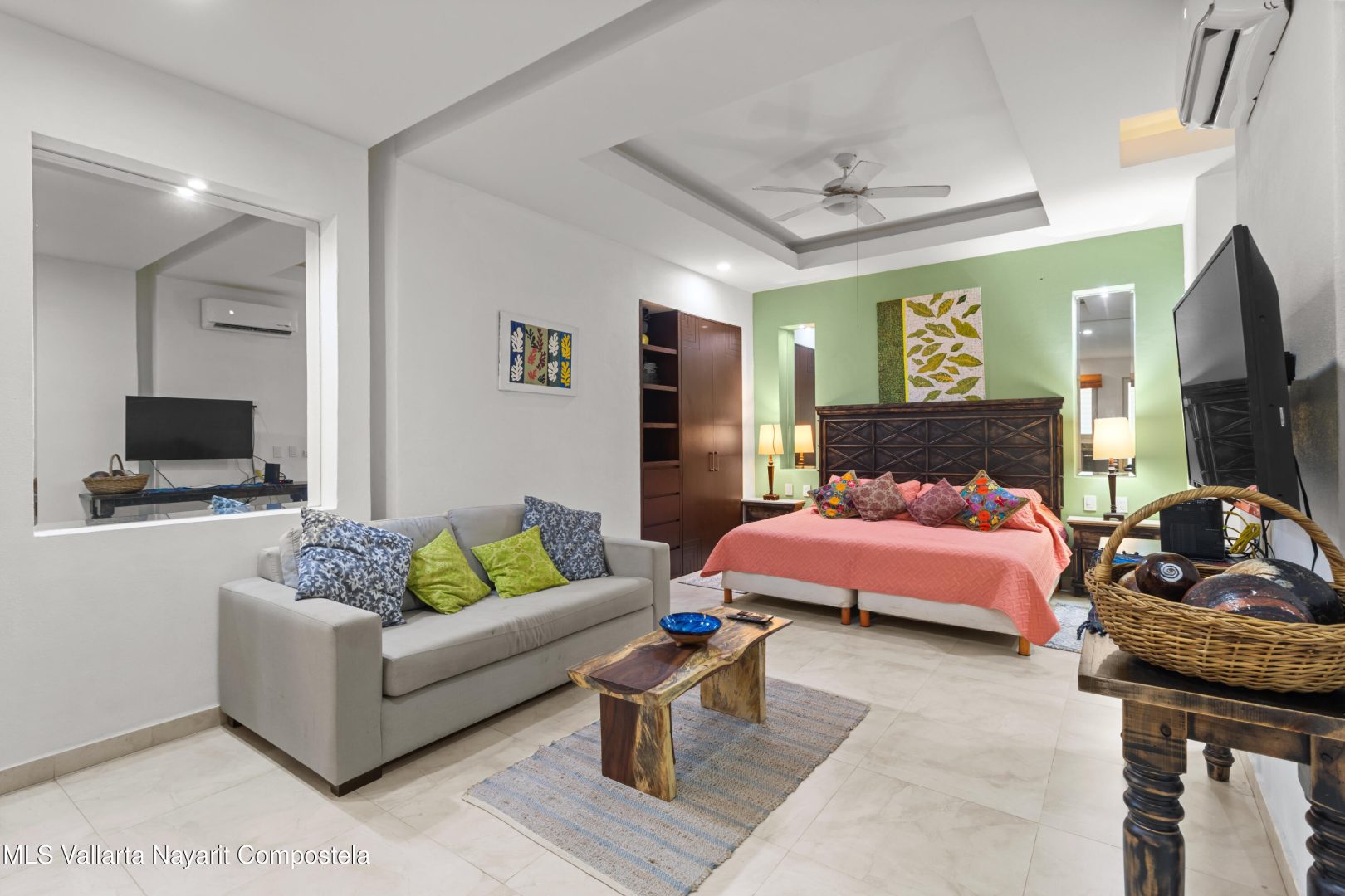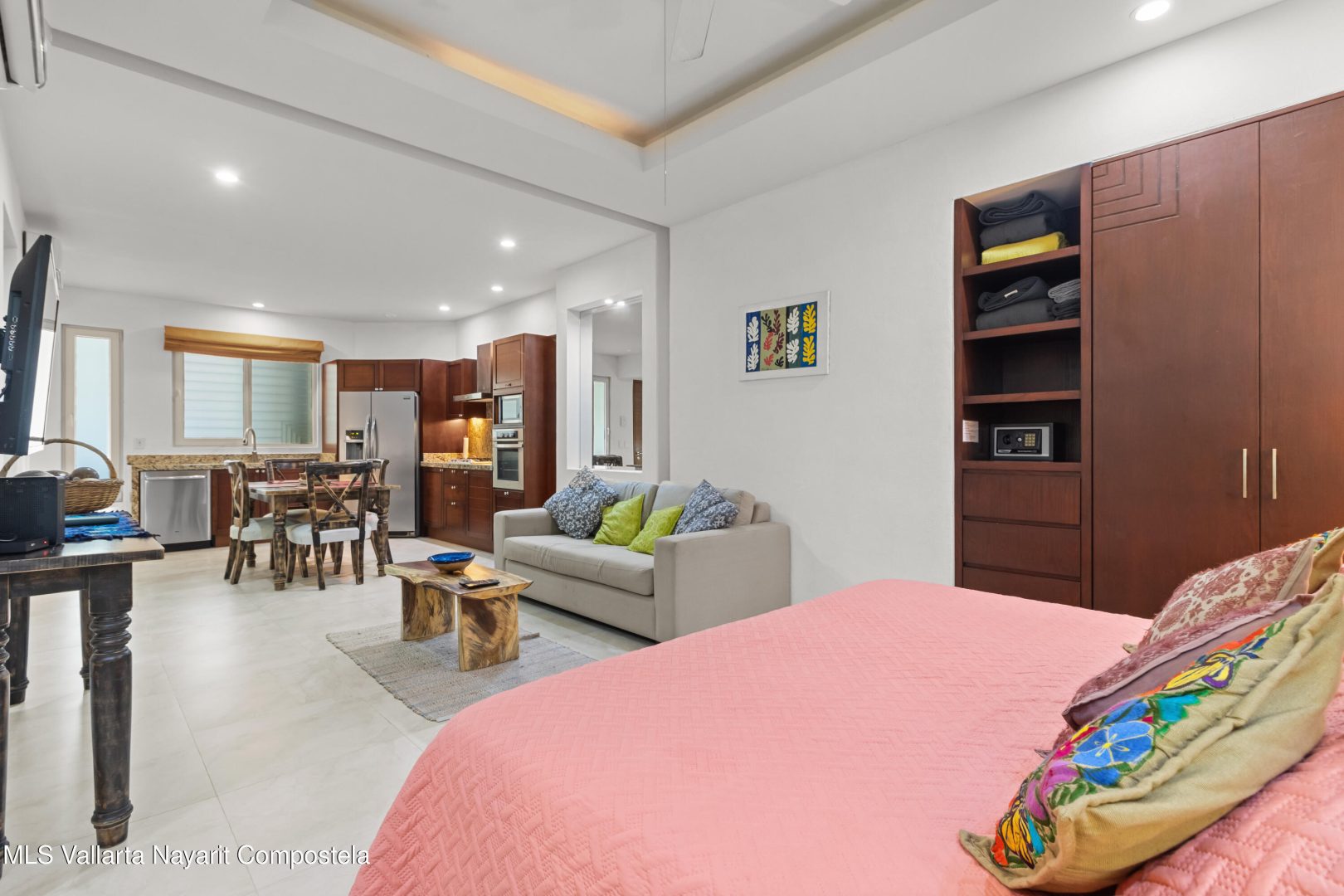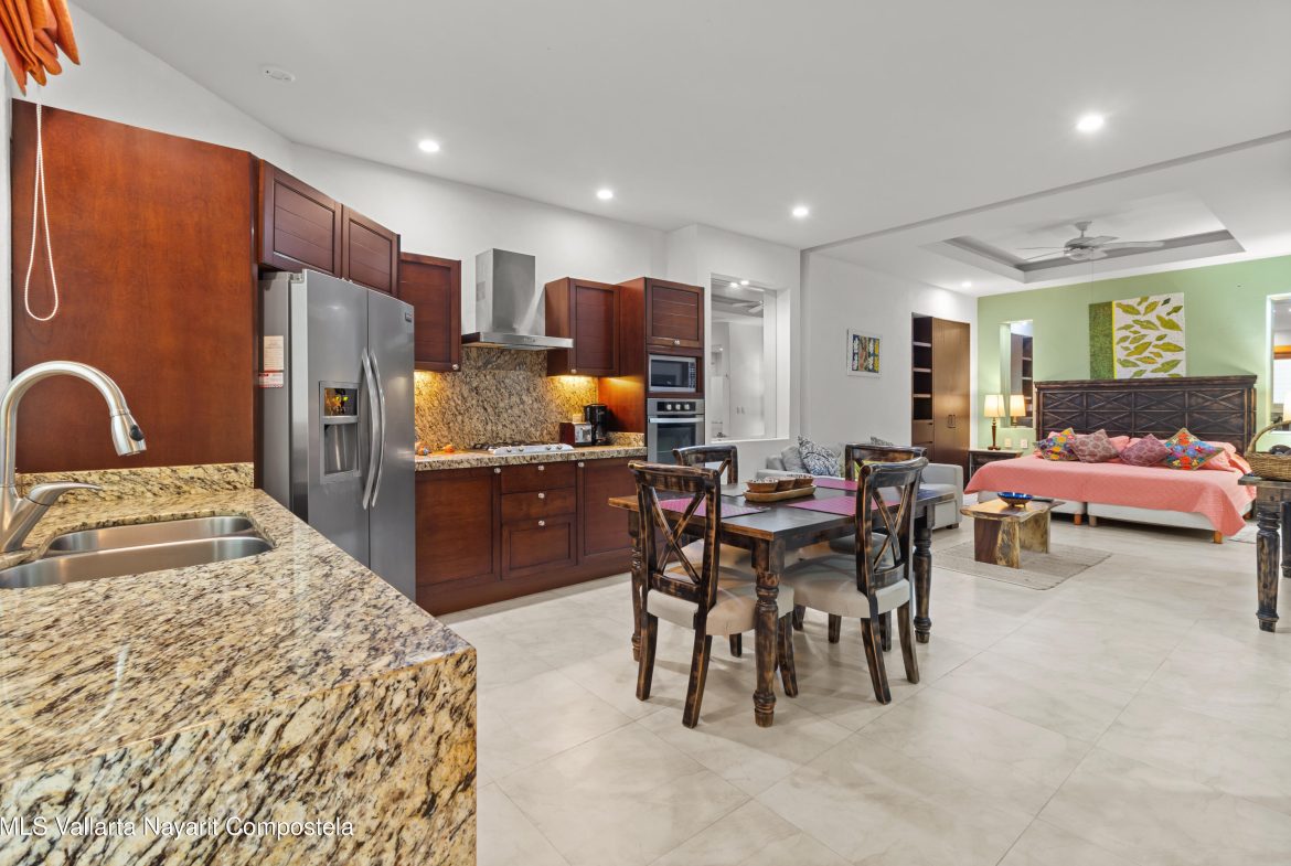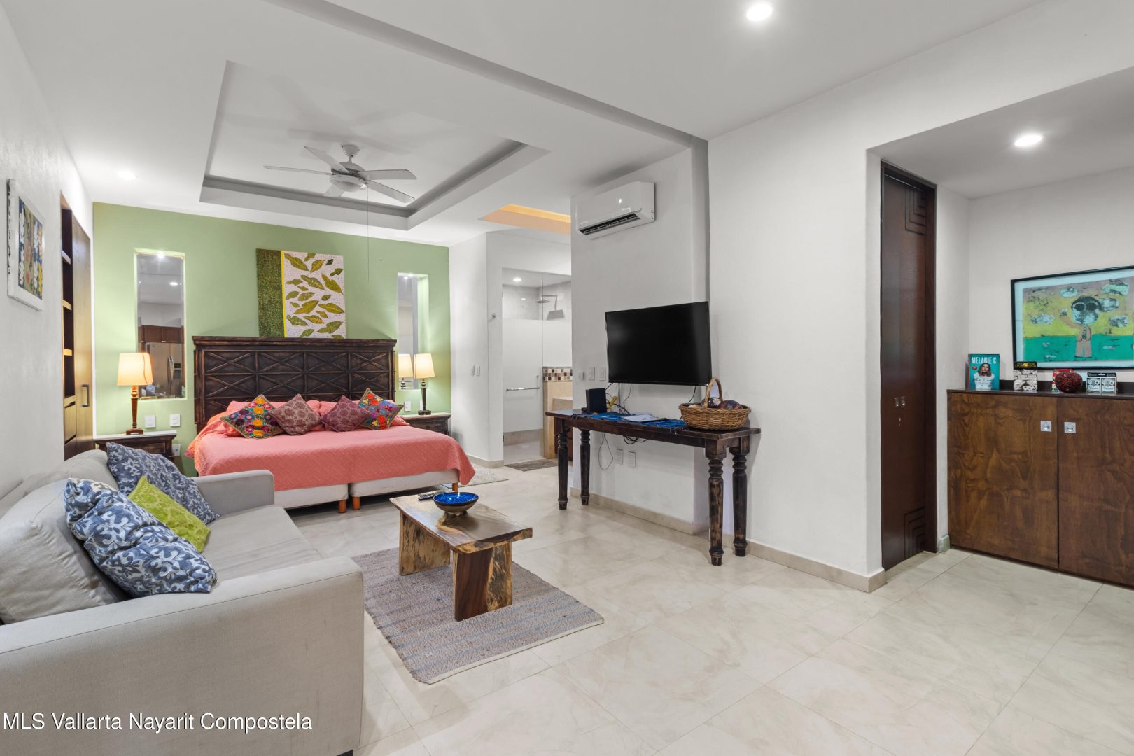 This sophisticated condo offers a perfect blend of comfort and privacy. Located on the 3rd-floor. The rooftop terrace boasts a heated infinity pool, Jacuzzi, BBQ grill, bar, and areas for dining and lounging, all with stunning 360-degree views of the Bay of Banderas, Sierra Madre Mountains, and Puerto Vallarta’s city lights. The remodeled one-bedroom, one-bath unit features a king-size bed, high-speed Wi-Fi, smart TV, air conditioning, a fully equipped kitchen, full-sized washer and dryer, and private parking and storage.