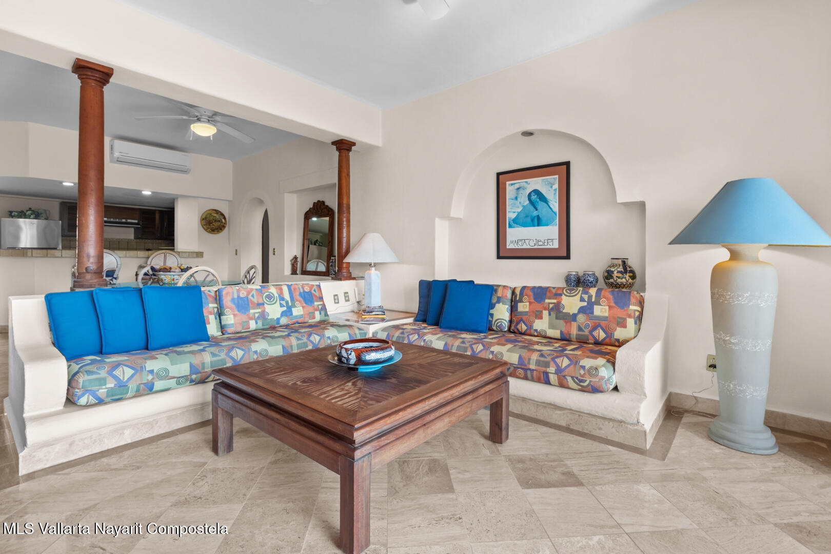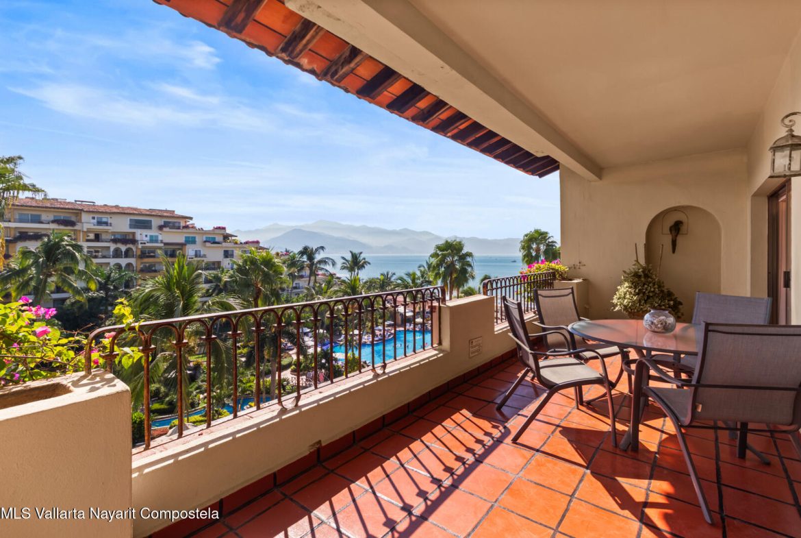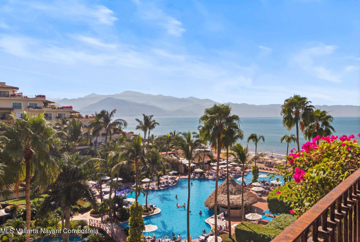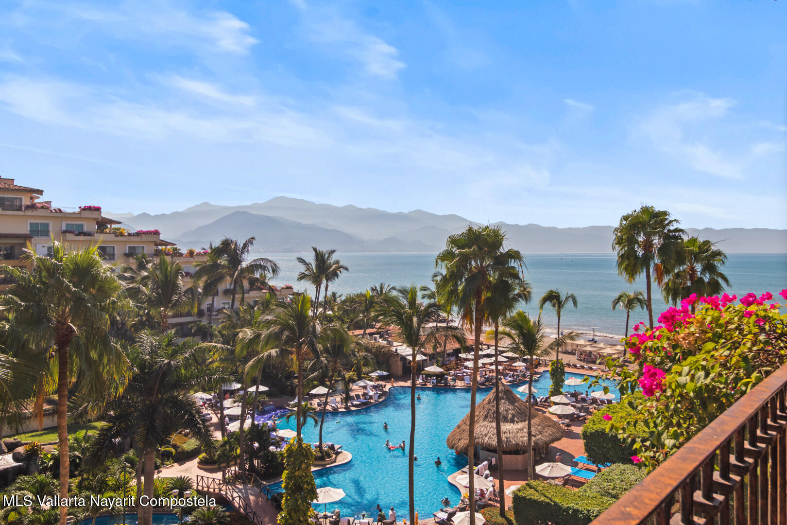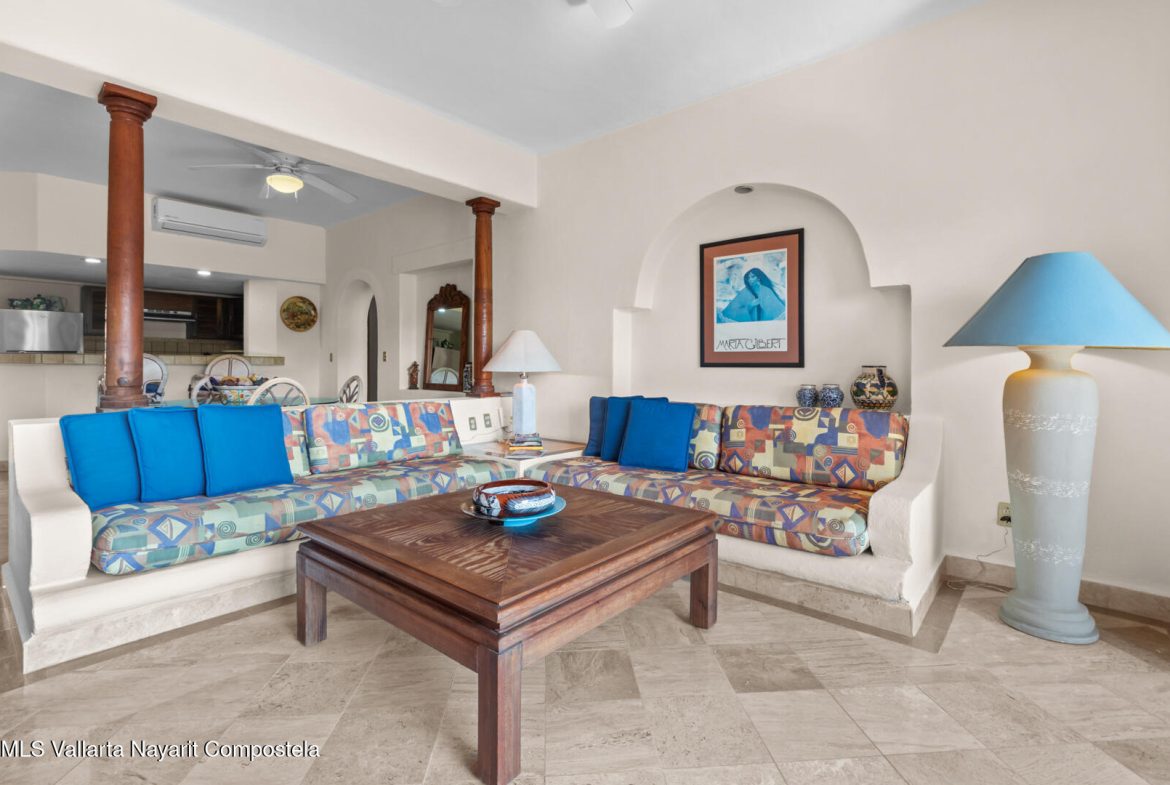 This spacious beachfront residence offers an exceptional lifestyle within a five-star luxury complex. The outdoor terrace presents panoramic views encompassing swaying palms, beach, bay, and town, creating a stunning backdrop for relaxation and entertaining. The open kitchen is equipped with bar seating and an adjacent dining area accommodating six, designed for both casual and formal meals. The living space includes built-in seating and sliding doors that open to the terrace, allowing seamless indoor-outdoor living and capturing refreshing ocean breezes. The restful primary suite features a king-sized bed, ample closet space, and a bathroom with marble accents. It also boasts ocean views and direct access to the terrace.