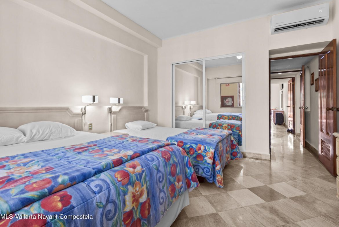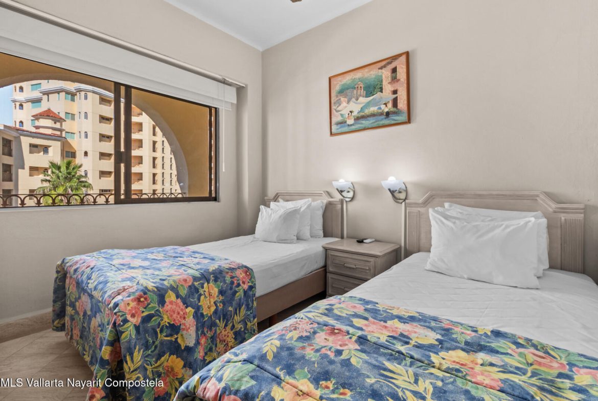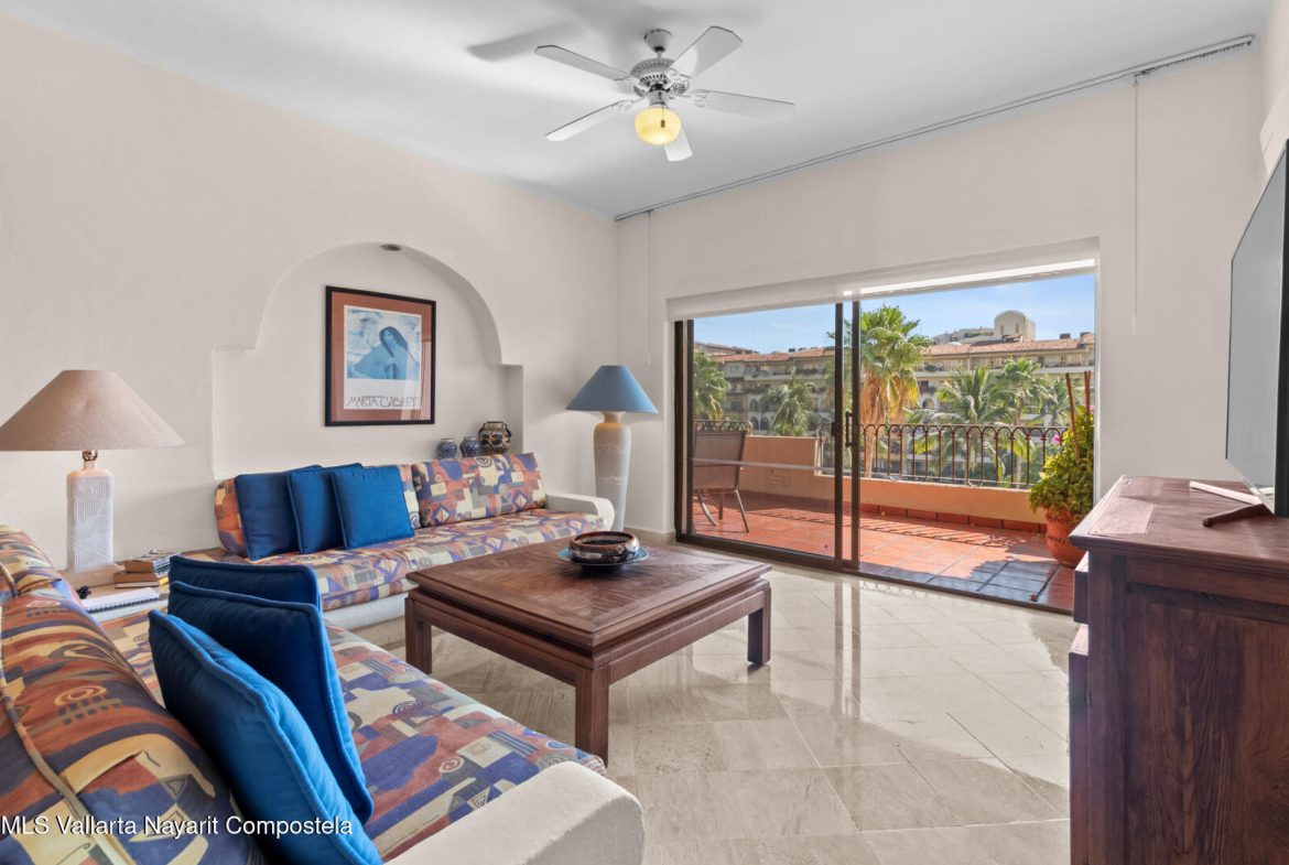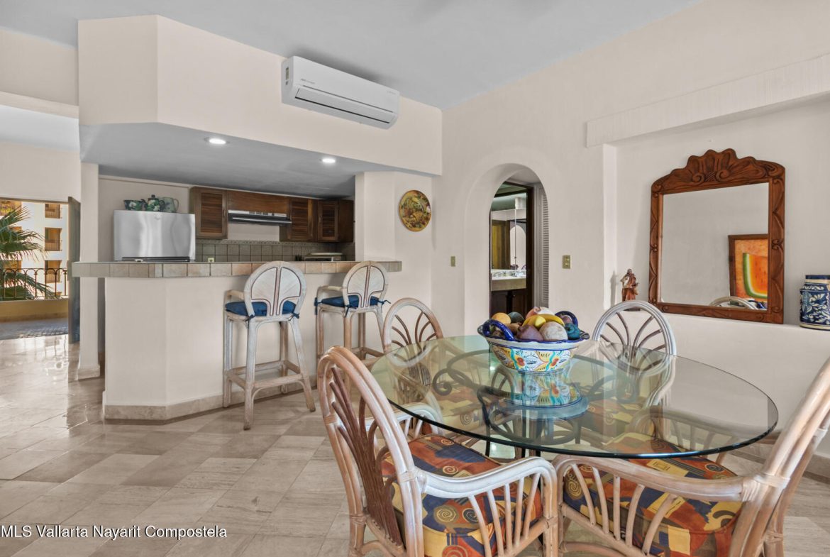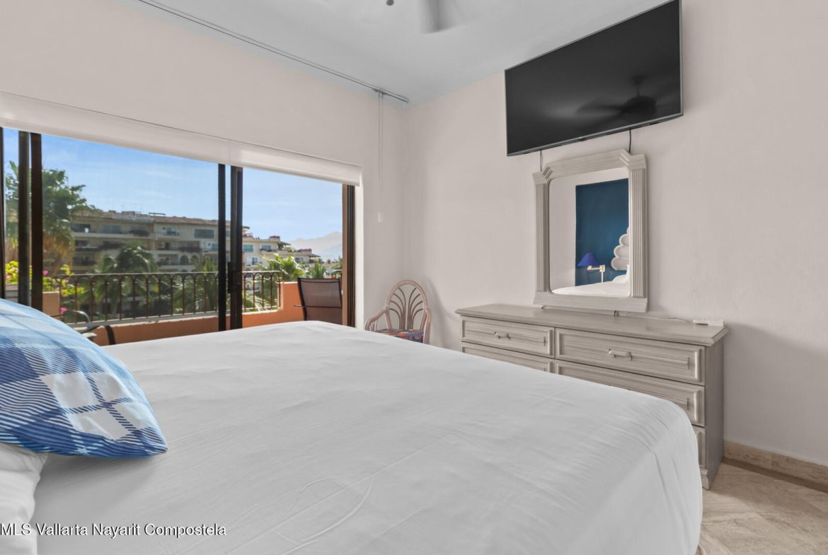 This spacious beachfront residence offers an exceptional lifestyle within a five-star luxury complex. The outdoor terrace presents panoramic views encompassing swaying palms, beach, bay, and town, creating a stunning backdrop for relaxation and entertaining. The open kitchen is equipped with bar seating and an adjacent dining area accommodating six, designed for both casual and formal meals. The living space includes built-in seating and sliding doors that open to the terrace, allowing seamless indoor-outdoor living and capturing refreshing ocean breezes. The restful primary suite features a king-sized bed, ample closet space, and a bathroom with marble accents. It also boasts ocean views and direct access to the terrace.
