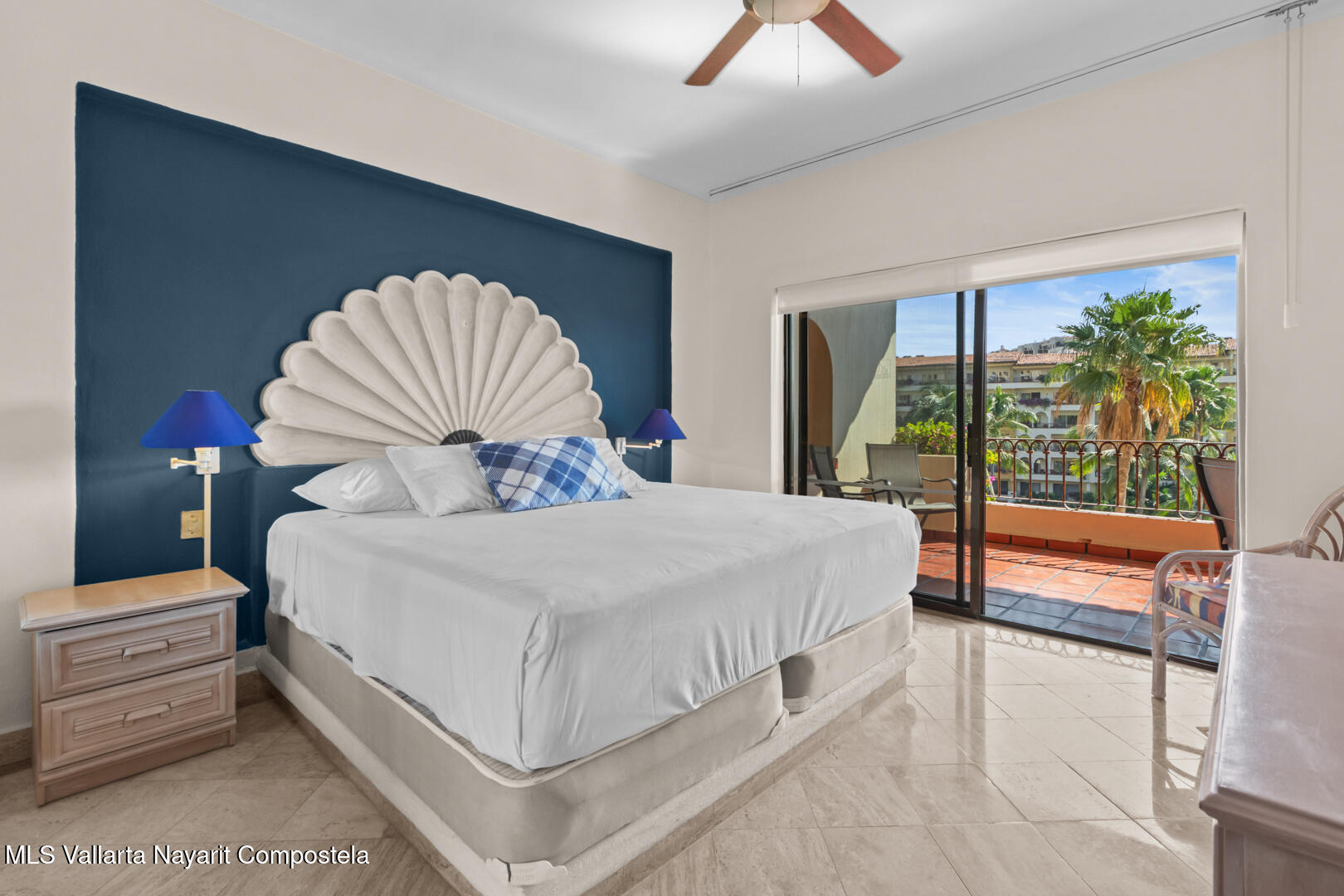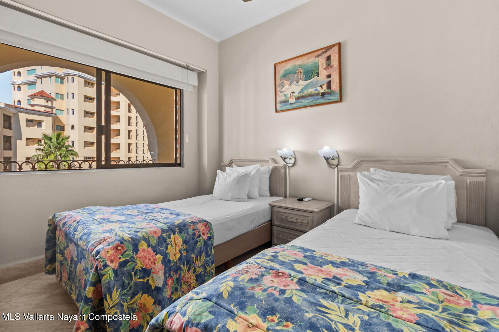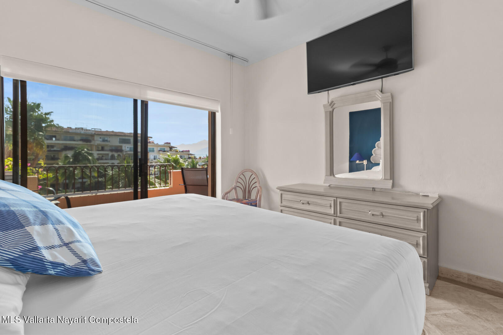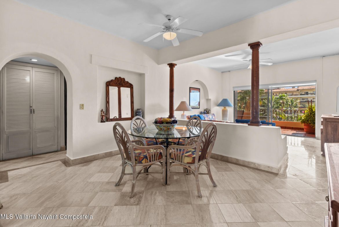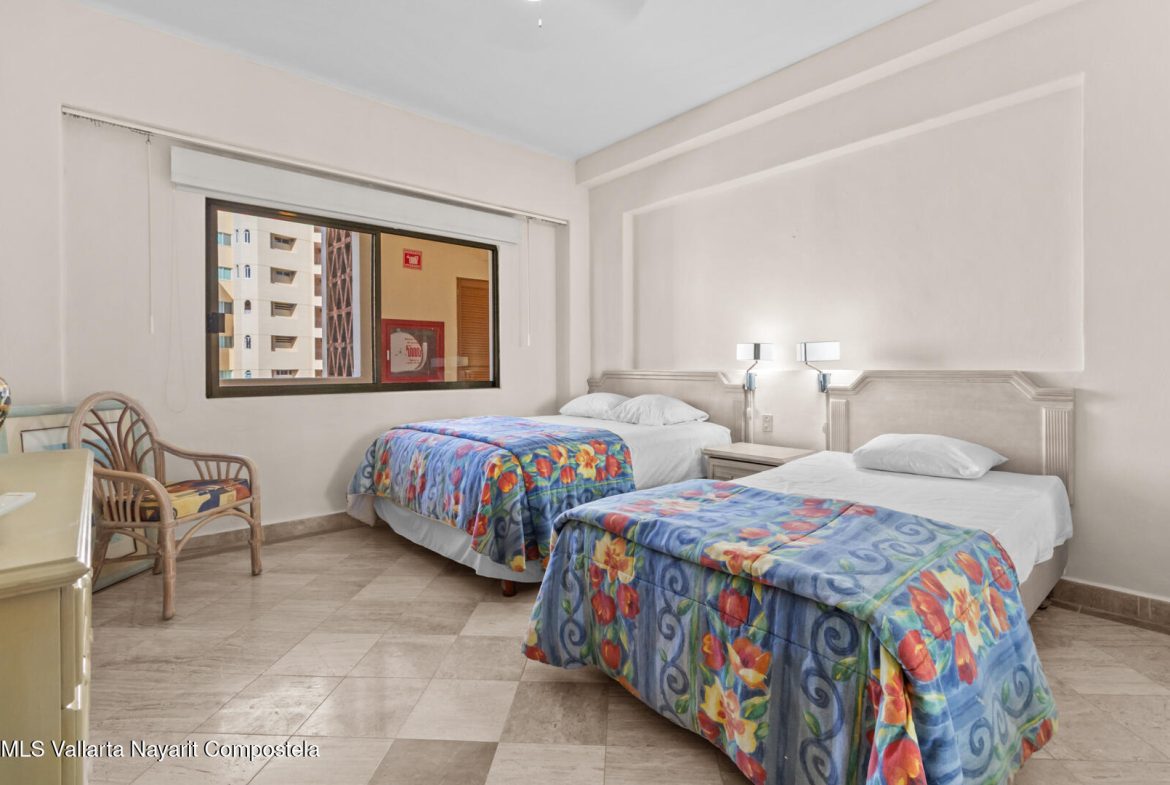 This spacious beachfront residence offers an exceptional lifestyle within a five-star luxury complex. The outdoor terrace presents panoramic views encompassing swaying palms, beach, bay, and town, creating a stunning backdrop for relaxation and entertaining. The open kitchen is equipped with bar seating and an adjacent dining area accommodating six, designed for both casual and formal meals. The living space includes built-in seating and sliding doors that open to the terrace, allowing seamless indoor-outdoor living and capturing refreshing ocean breezes. The restful primary suite features a king-sized bed, ample closet space, and a bathroom with marble accents. It also boasts ocean views and direct access to the terrace.