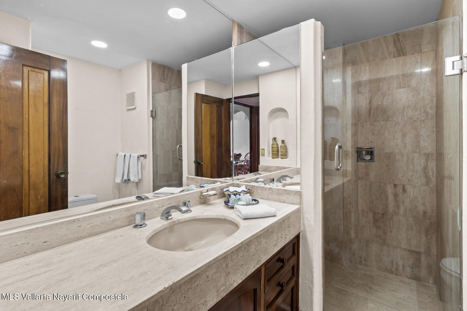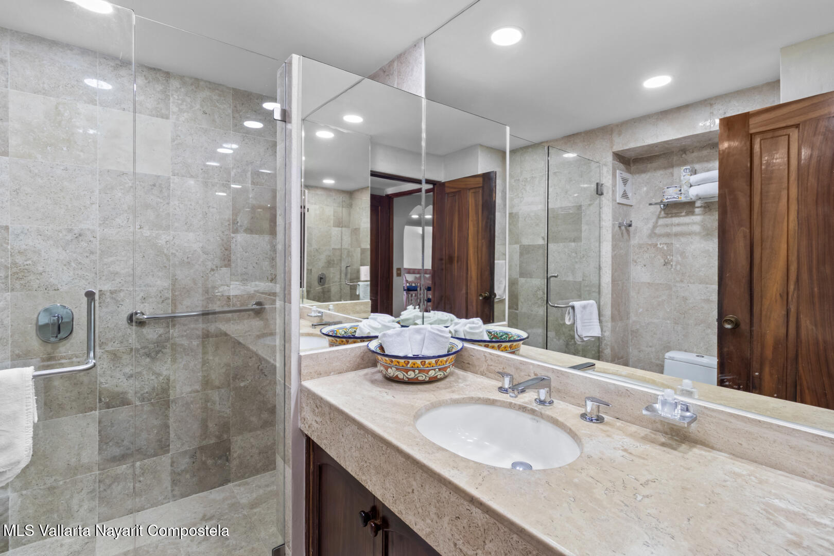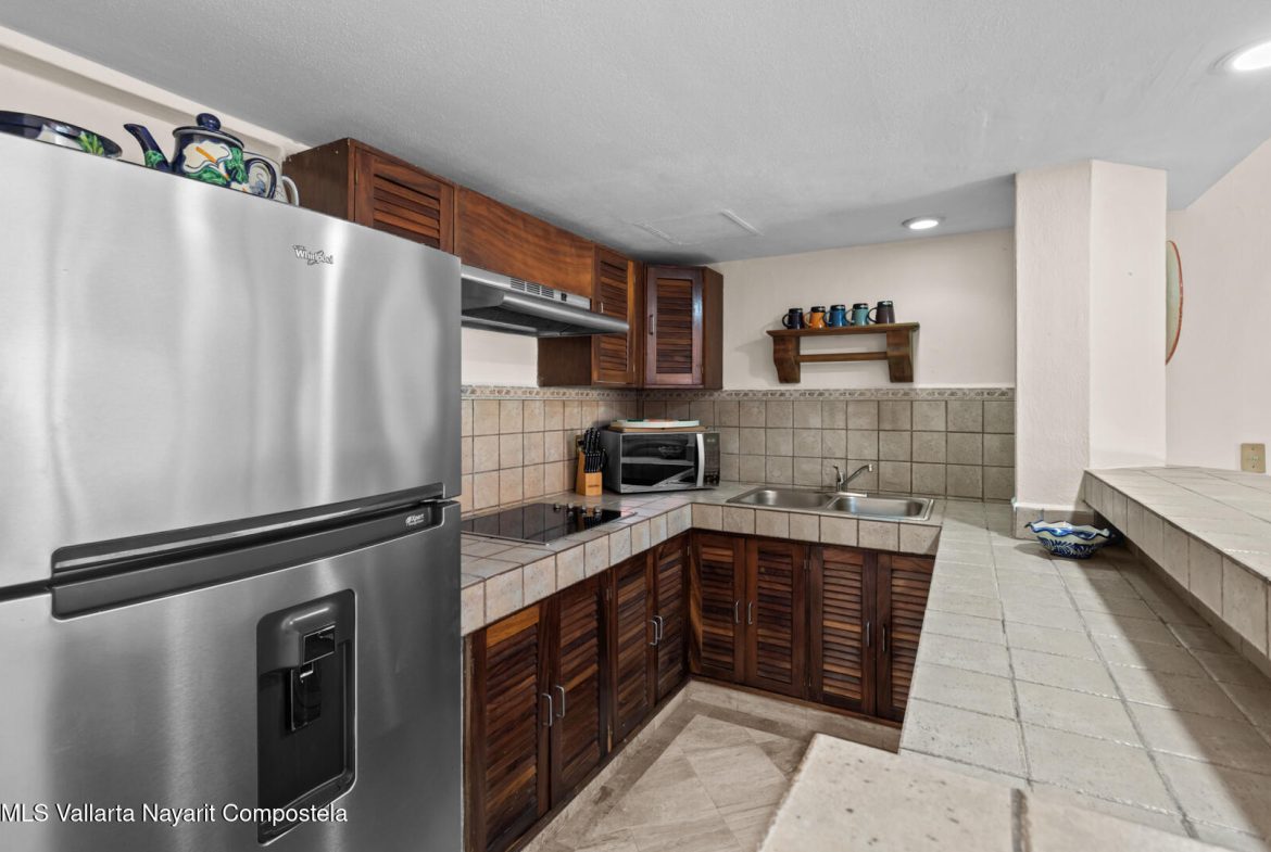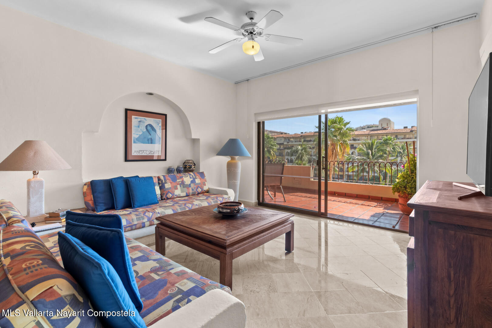 This spacious beachfront residence offers an exceptional lifestyle within a five-star luxury complex. The outdoor terrace presents panoramic views encompassing swaying palms, beach, bay, and town, creating a stunning backdrop for relaxation and entertaining. The open kitchen is equipped with bar seating and an adjacent dining area accommodating six, designed for both casual and formal meals. The living space includes built-in seating and sliding doors that open to the terrace, allowing seamless indoor-outdoor living and capturing refreshing ocean breezes. The restful primary suite features a king-sized bed, ample closet space, and a bathroom with marble accents. It also boasts ocean views and direct access to the terrace.