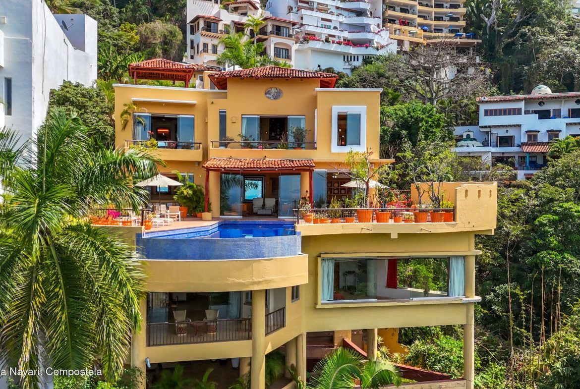 This grand villa in the iconic Conchas Chinas neighborhood offers panoramic ocean views, luxurious finishes, generous spaces and refined living. A serene walkway framed by tropical plants and flowers leads to the main entrance, where a spectacular vaulted foyer gives a first glimpse of the impressive great room, featuring elegant indoor entertaining areas, dining for twelve and frameless glass doors that open onto a lavish outdoor terrace, garden and infinity-edge pool. The chef’s kitchen is a true showpiece, with abundant natural light, peninsula counter and center island, solid wood cabinetry, and commercial-grade appliances. A generous bedroom suite with impressive bathroom and direct access to the outdoor terrace and powder room are conveniently located on this level.
