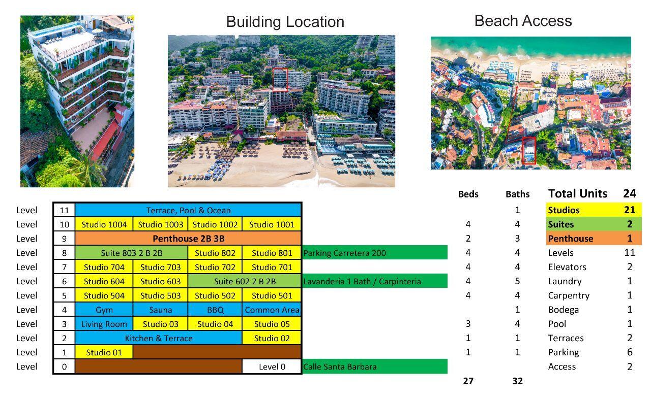 Villa Olivia is an investor’s dream on the Southside of the Romantic Zone ready to be turned into a boutique hotel, B&B; corporate retreat or a family building with income suites. It comprises 21 large studios, 2-2 bedroom apartments; a large 2 bedroom Penthouse; rooftop terrace with pool, bar area and covered sitting spaces; large kitchen breakfast/dining area; reading lounge; professional laundry; gym; sauna and additional sundeck terrace. Gated upper parking. A block away from Playa Los Muertos and Blue Chairs.Villa Olivia es el sueno de cualquier inversionista en la zona sur de la Zona Romantica, lista para convertirse en un hotel boutique, un B&B, un retiro corporativo o un edificio familiar con suites para familias. Consta de 21 amplios estudios, apartamentos de 2 y 2 recamaras;