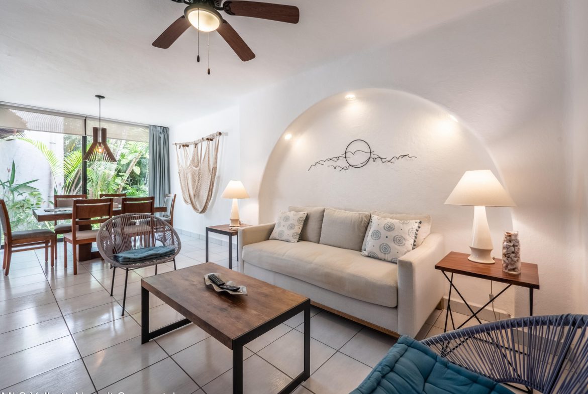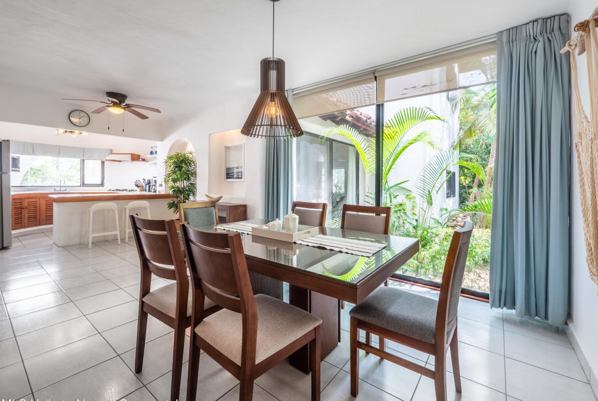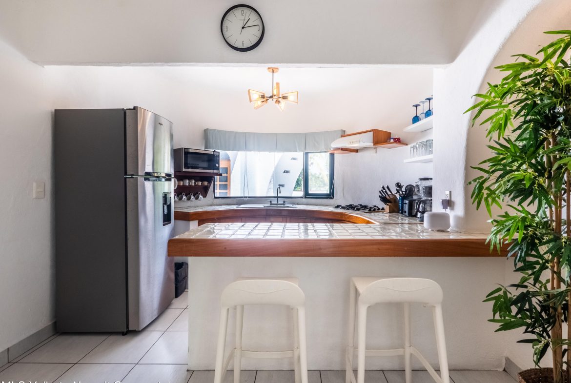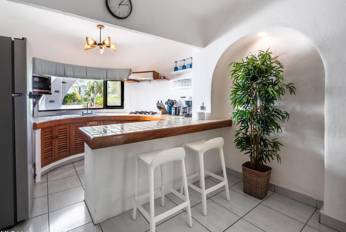 Villa Pelicanos is one of the 37 villas that border the Marina Vallarta golf course, where nature and privacy blend in harmonious balance. On the ground floor, the living room opens onto a garden-surrounded patio, creating a warm and seamless atmosphere next to a practical kitchen and a half bathroom. On the upper level, two light-filled bedrooms elevate the space with high ceilings: one featuring wooden finishes and the other an elegant dome; both include a full bathroom and a laundry center. The common areas offer a pool with a wonderful view of the golf course. The villa includes underground parking and a private storage room next to its assigned space. Security 24 hours. Close to shops, restaurants, and the Marina boardwalk.