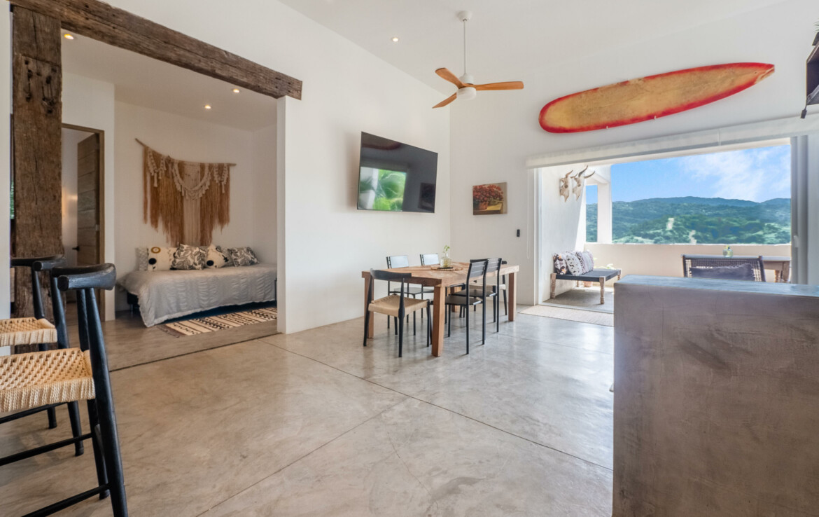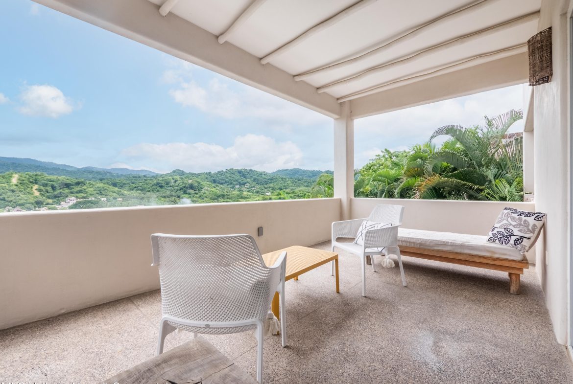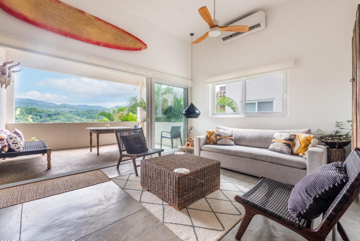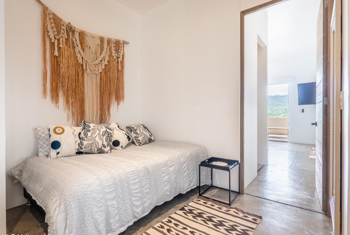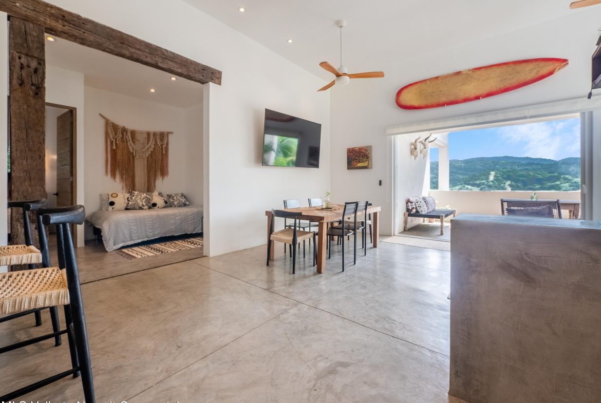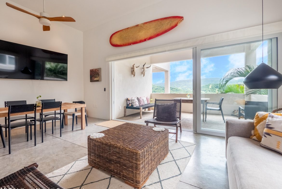 Perched atop Sayulita’s premier Gringo Hill neighborhood,Vista Amanecer offers a luxurious and sophisticated retreat that reflects the merging ofinspiration and architecture. Designed by renowned local architect Oliverde la Cueva. This 2 bedroom, 2.5 bath fully furnished unit embodiesmasterful design and modern luxury featuring spacious, open floor plan,polished concrete flooring, 11.5 ft. ceilings, and high-end finishes. Vista Amanecer offers spacious, sweeping views of the lush, tropicalmountains as the kitchen and living space flow seamlessly into an outdoor dining and lounge area.