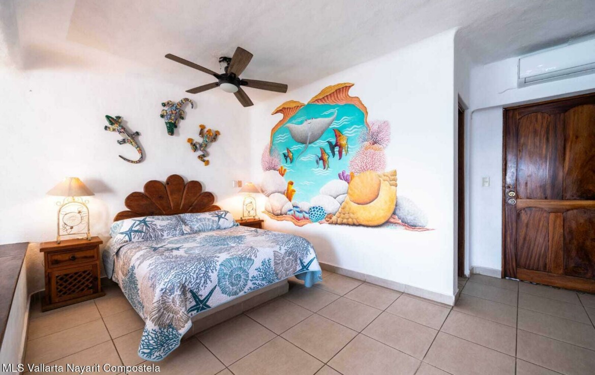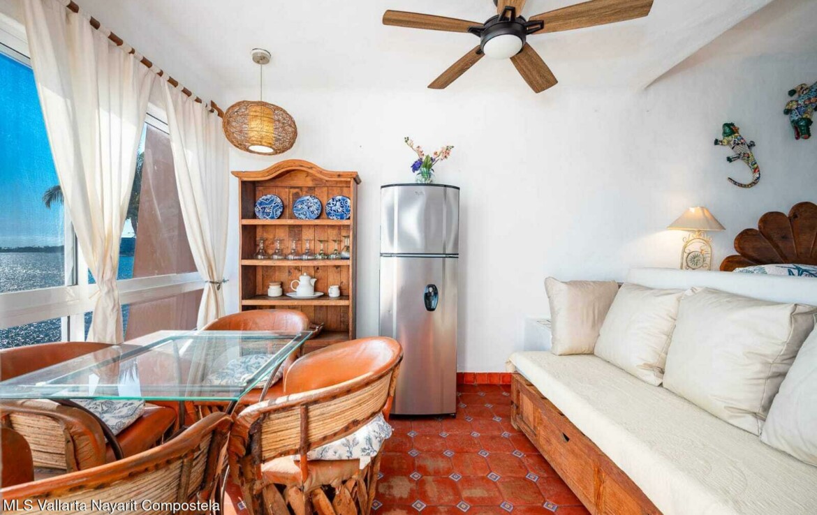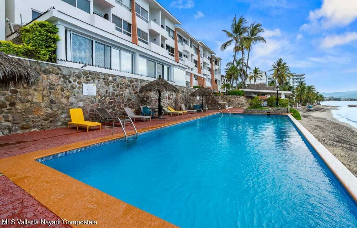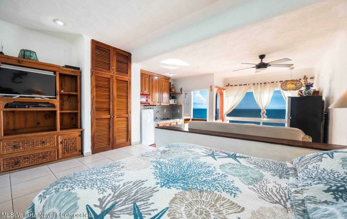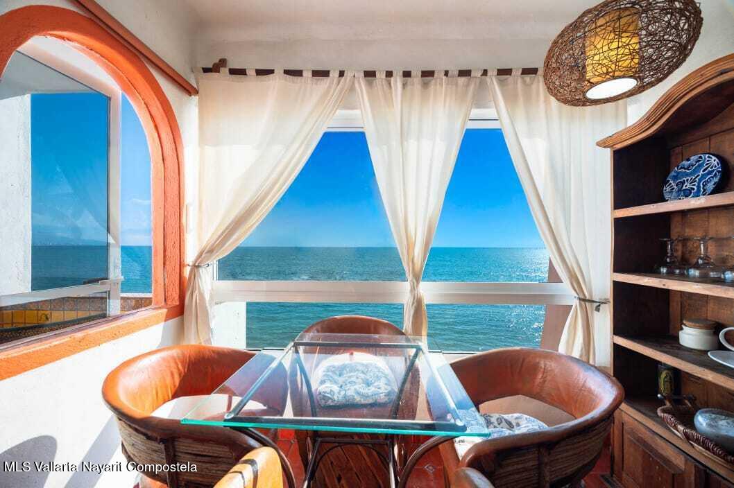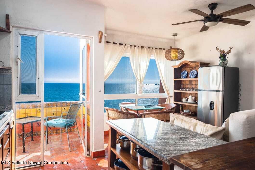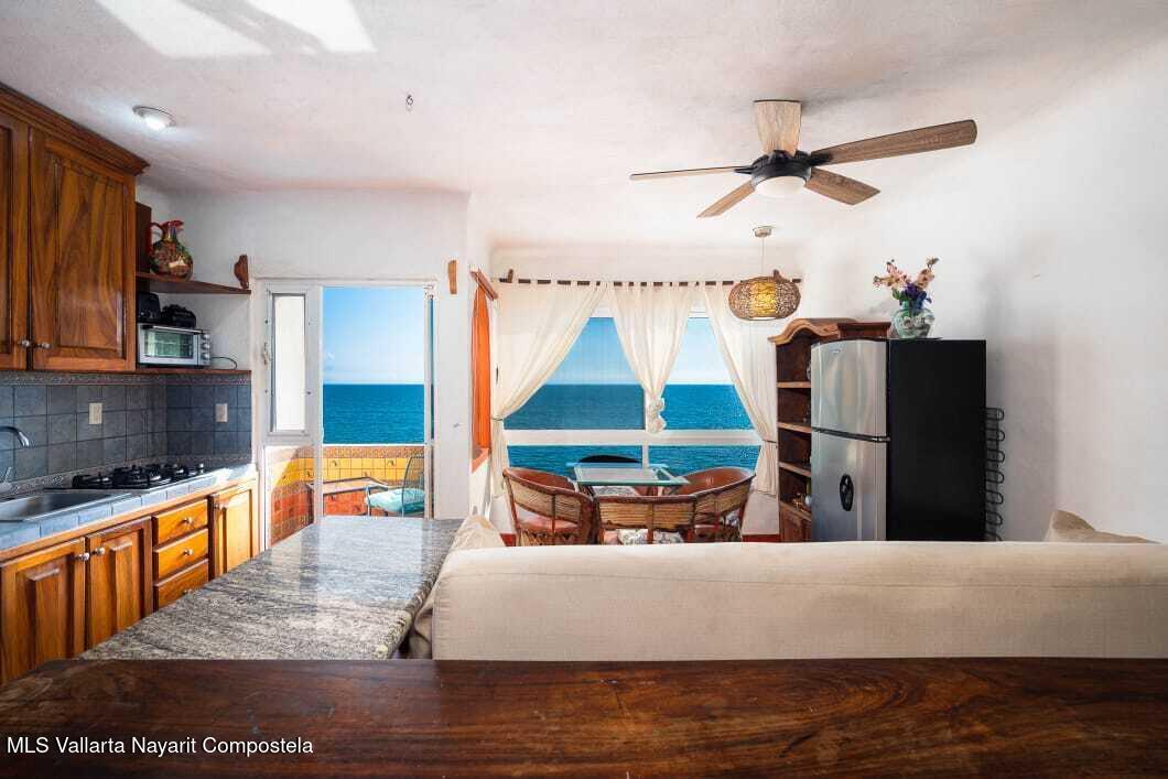 Experience the perfect blend of comfort and breathtaking ocean views in this cozy, studio. Located just steps from the beach with southern exposure, this charming unit offers panoramic views of the Bay of Banderas, with stunning sunsets to enjoy every evening.Wake up to the gentle ocean breeze and enjoy your morning coffee on your private balcony, surrounded by palm trees and the serene sounds of the waves. The spacious, vaulted ceilings enhance the bright and airy atmosphere.The unit comes fully furnished and ready for you to move in!Situated in a well-maintained older gated building, the studio offers easy access to a variety of shared amenities including a swimming pool, jacuzzi, lobby, and oceanfront lounge areas