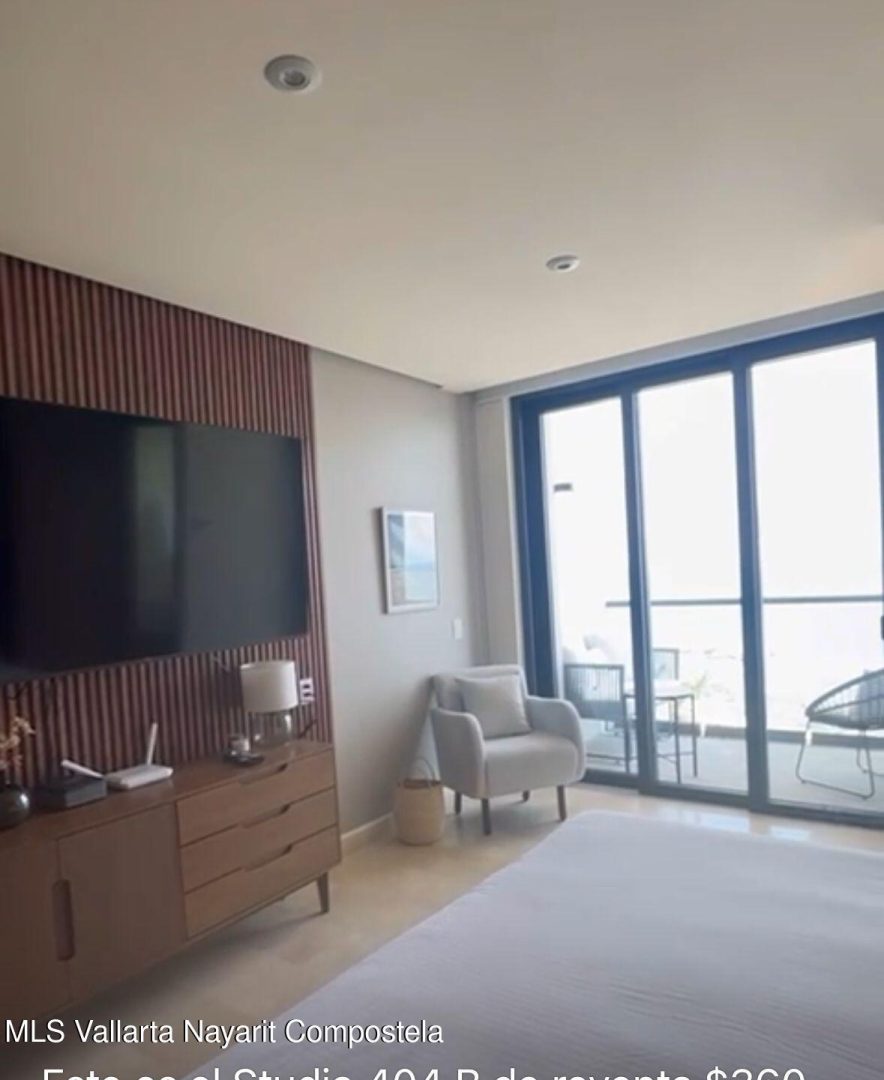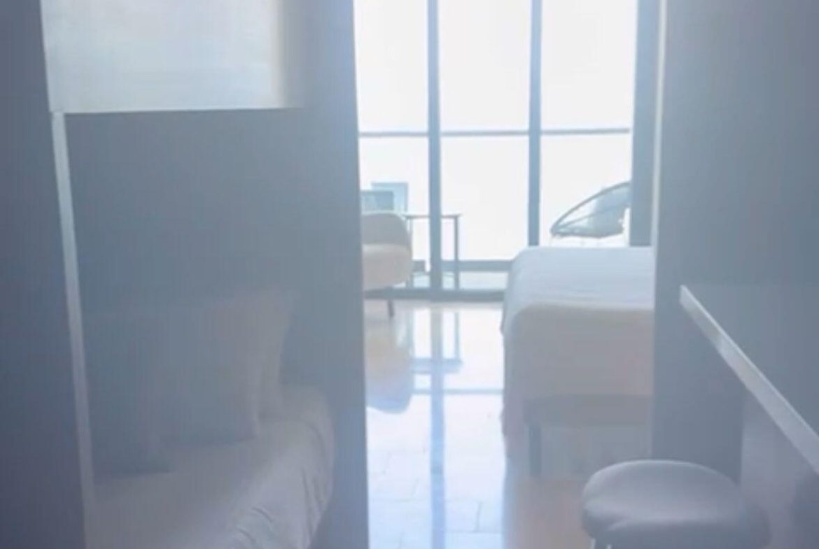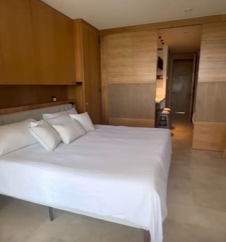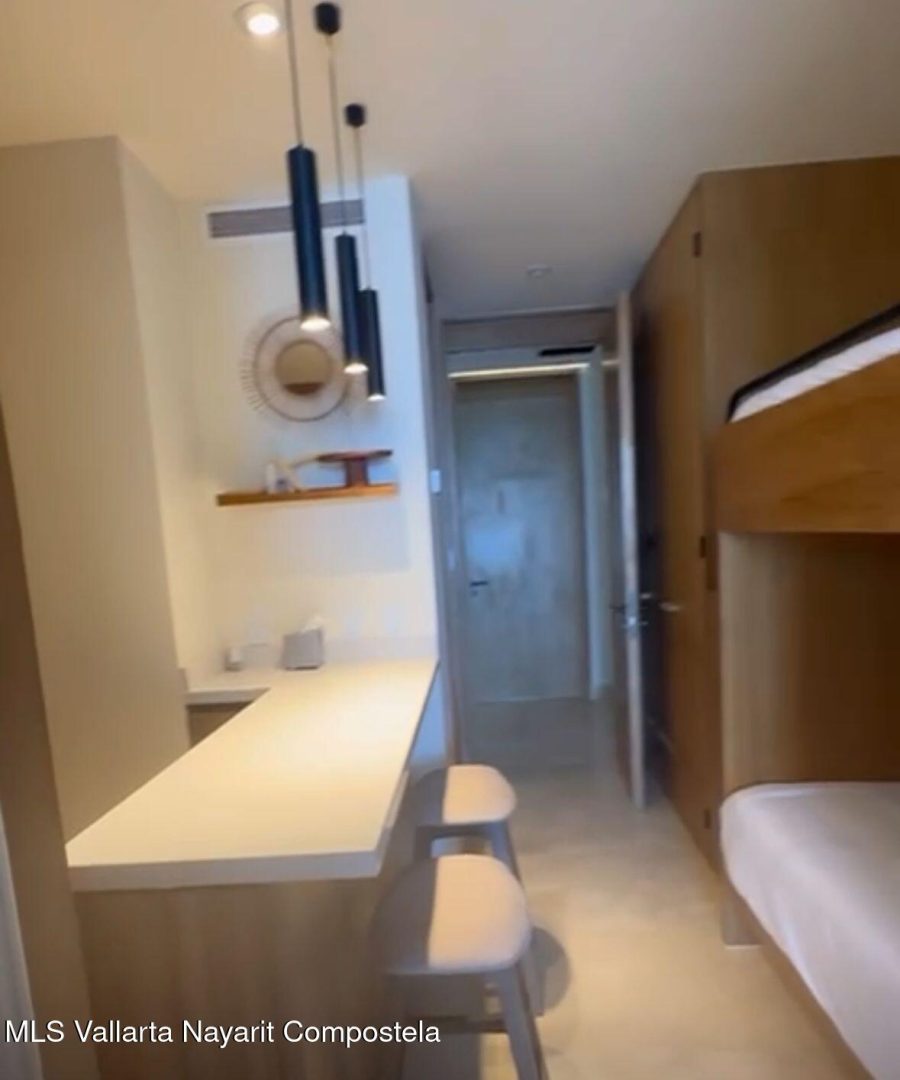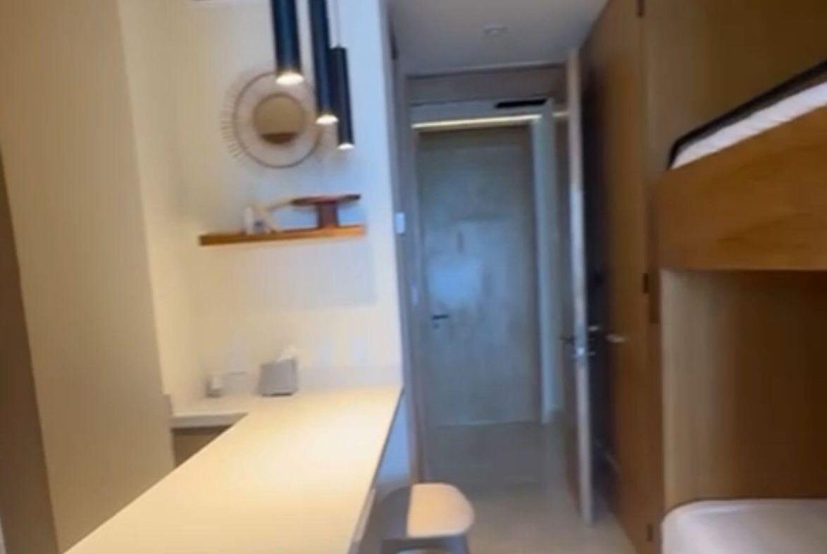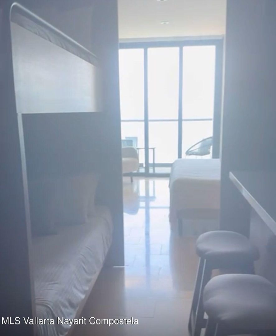 Estudio amueblado con vista al mar, literas y cama matrimonial.
