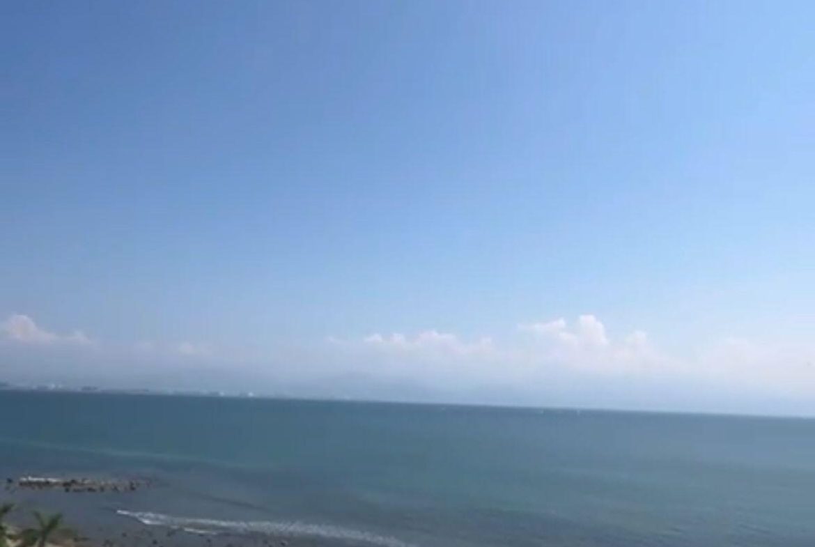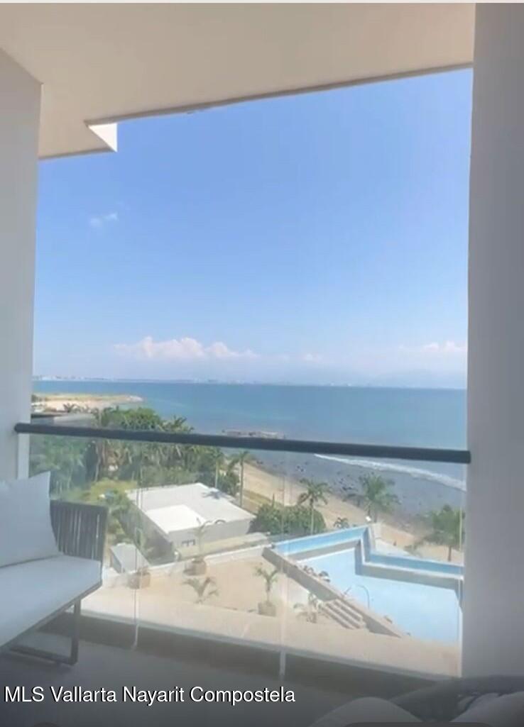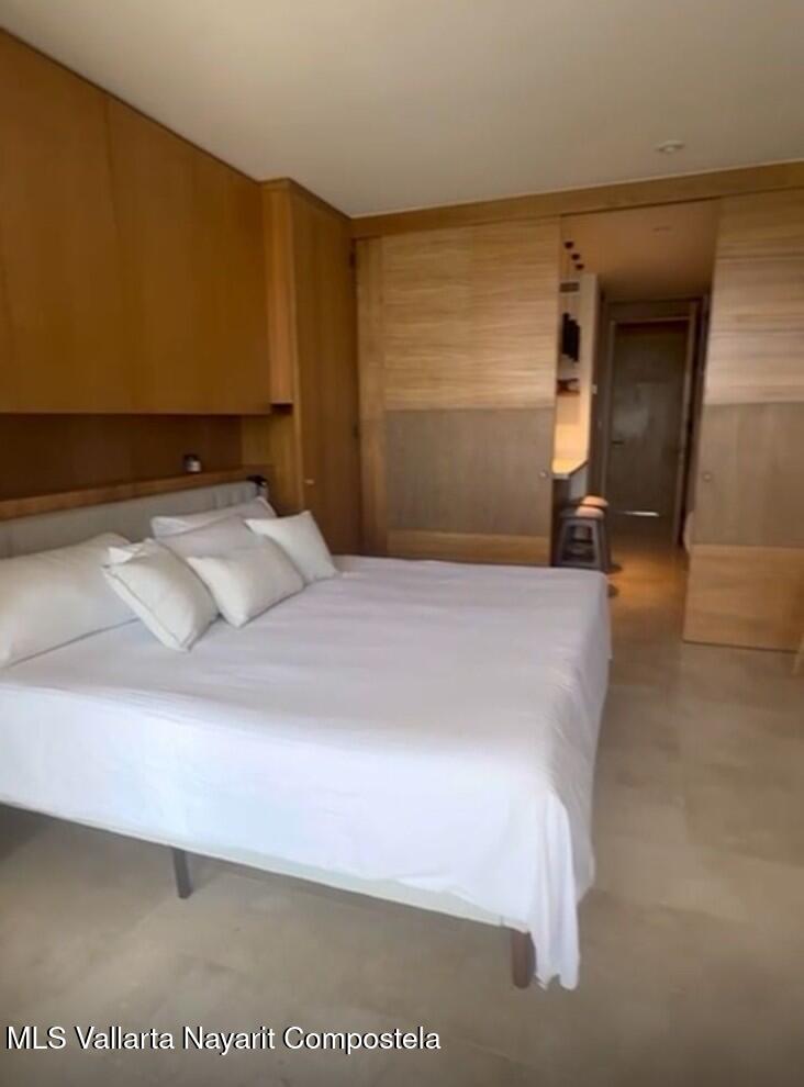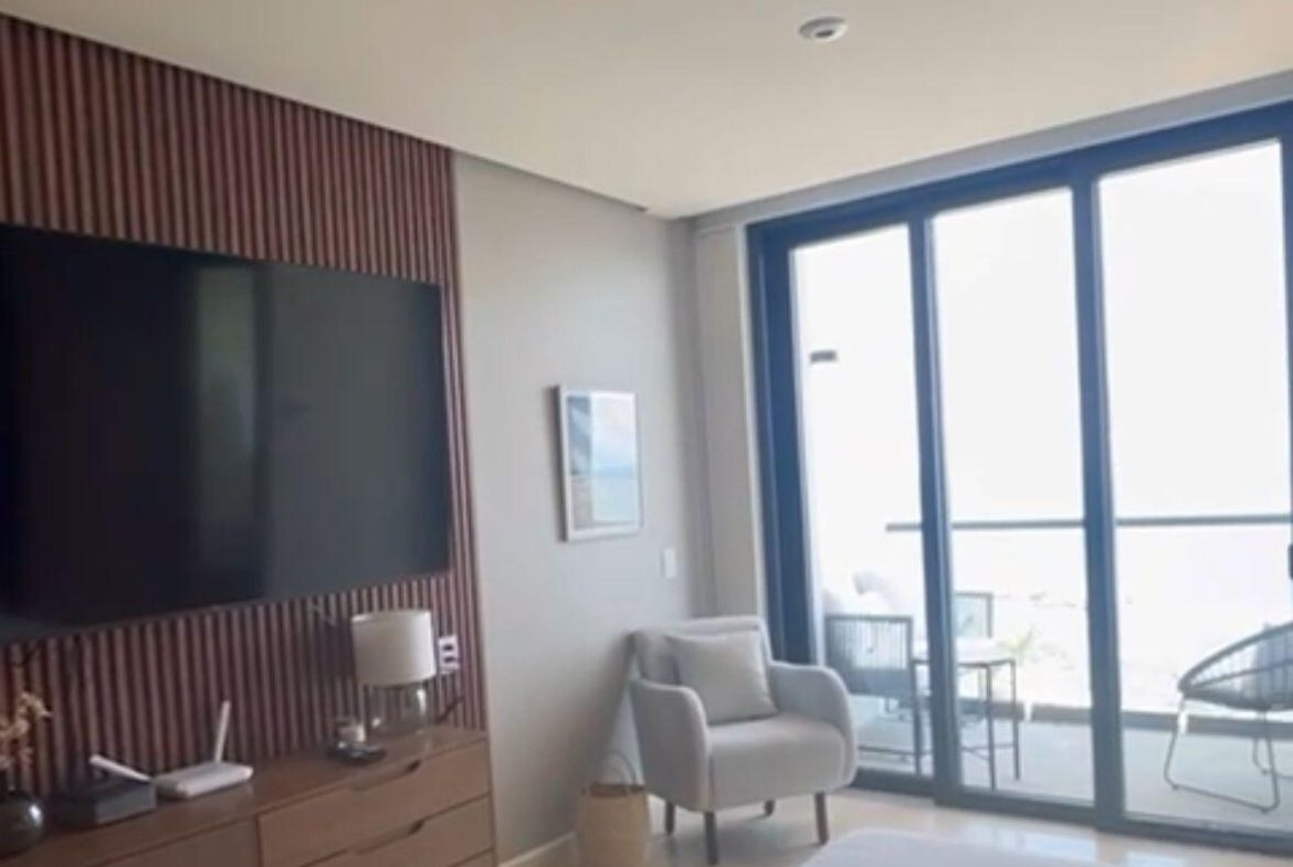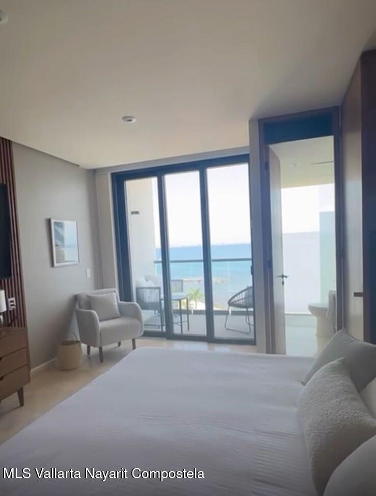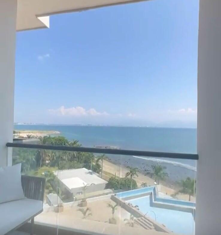 Estudio amueblado con vista al mar, literas y cama matrimonial.