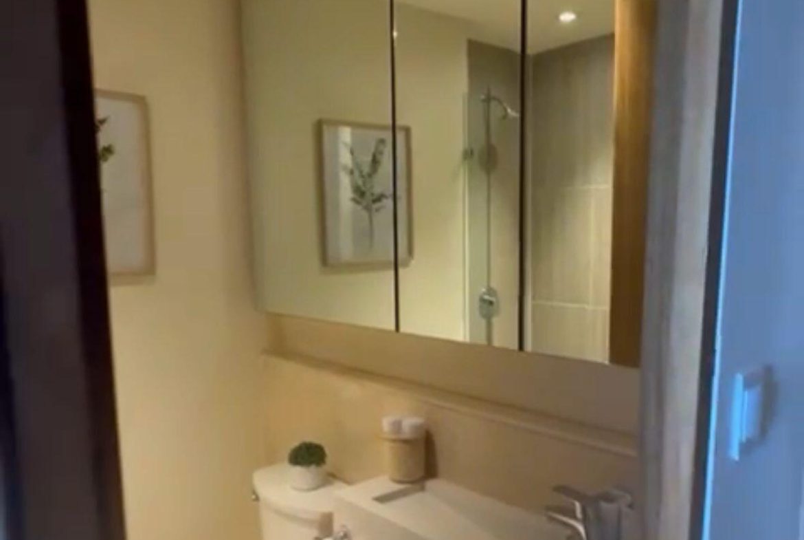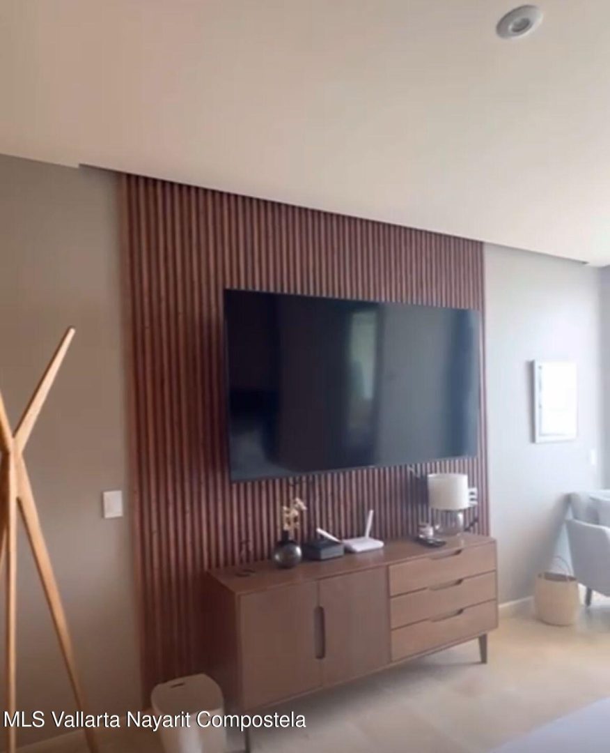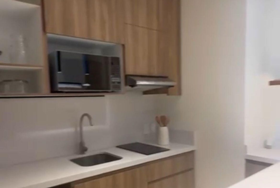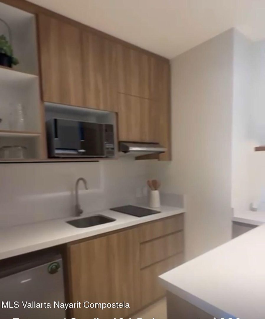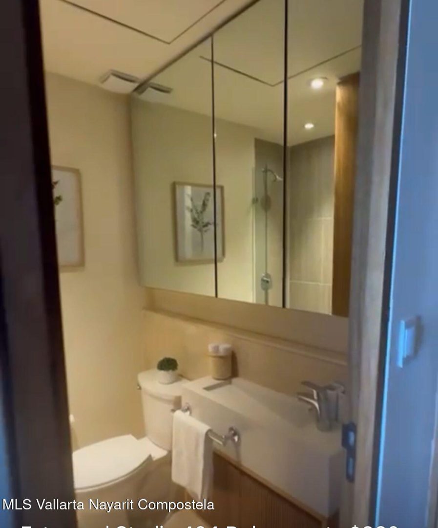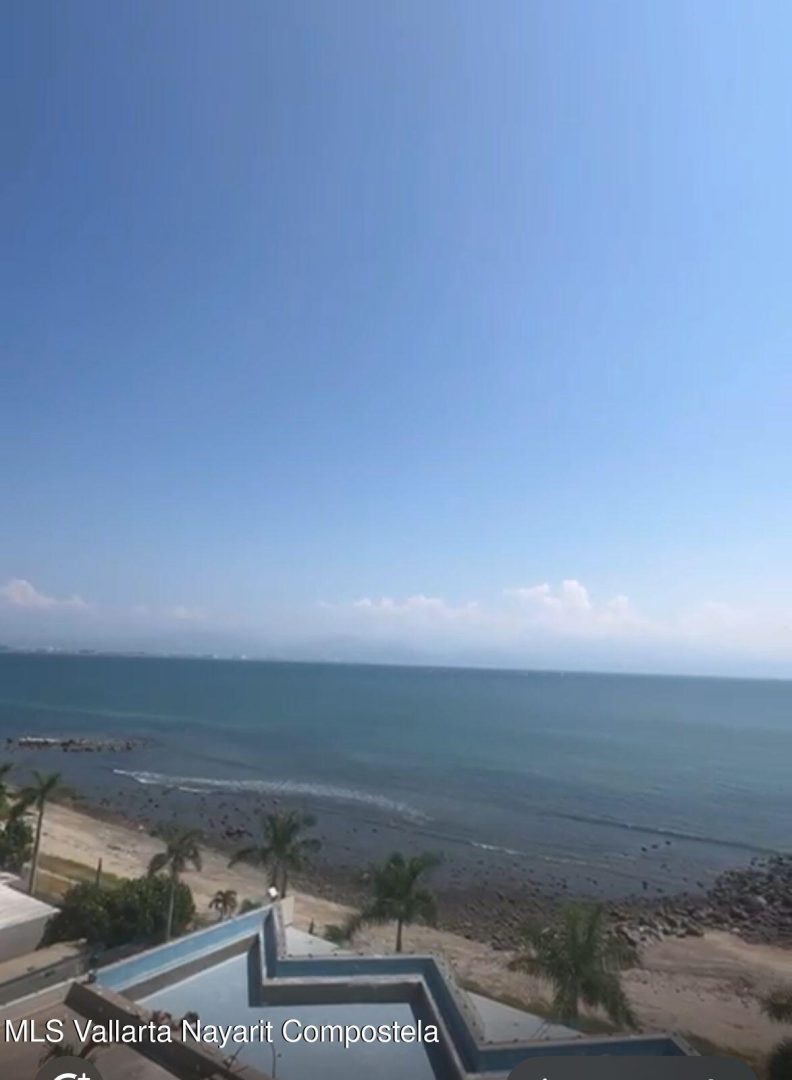 Estudio amueblado con vista al mar, literas y cama matrimonial.
